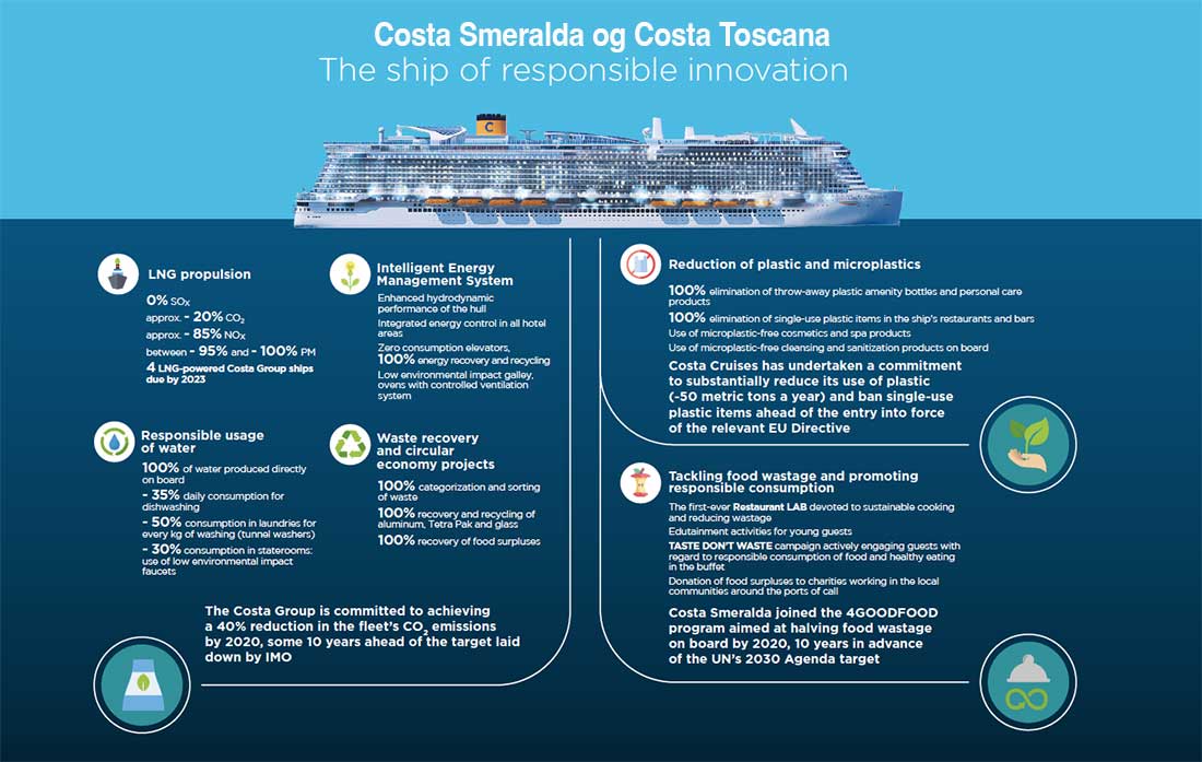 De 2 skibe som i øjeblikket kan brøste sig af denne teknologi er Costa Smeralda og Costa Toscana. To megaskibe med op til godt 6000 passagerer og med et kæmpe udbud af muligheder ombord. Men der er meget mere end energiforbrug - Costa har tænkt hele vejen rundt....