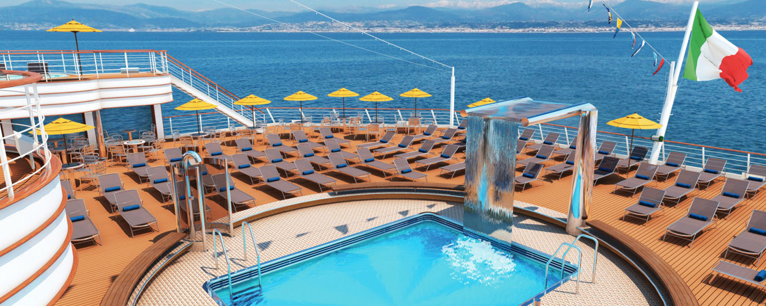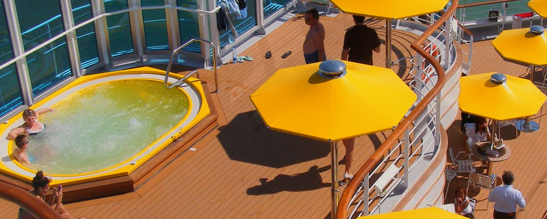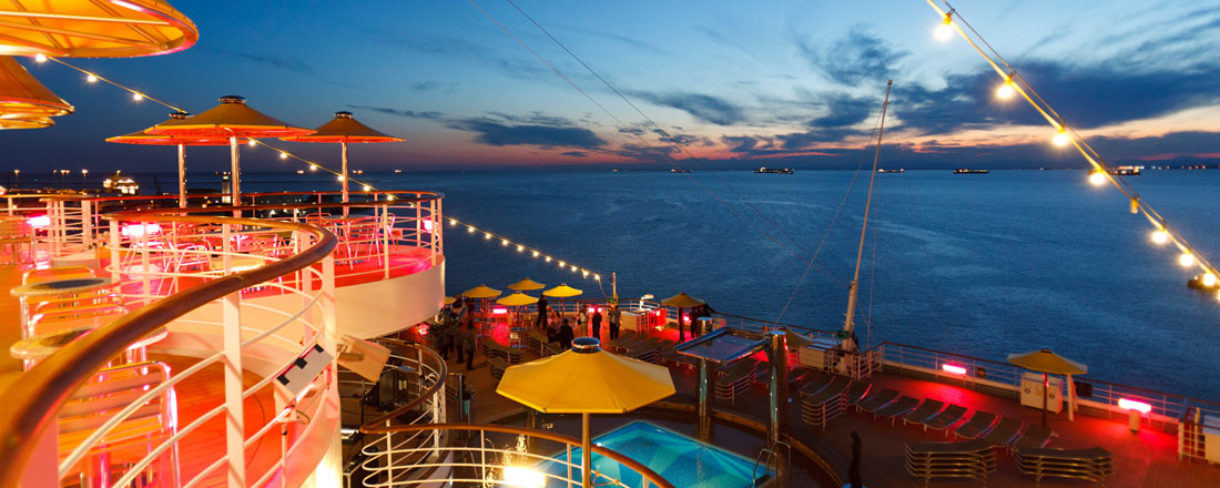 På dæk 10 ligger det store indbydende soldæk med poolområde og liggestole.