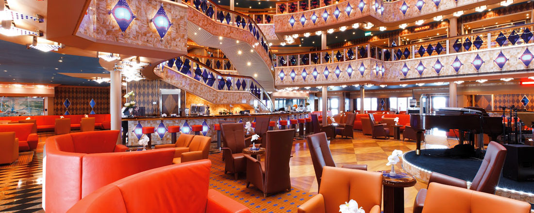 Skibet har 14 dæk, hvoraf dæk 1 til 14 er for passagerer. I forenden, midten og bagenden ligger skibets elevatorer. Dæk 3 er indgangsdæk med reception, udflugtssalg, business center og atrium. På dæk 3 og 4 findes skibets hovedrestauranter med a-la-carte servering. Disse er inkluderet i dit krydstogt. Derudover findes der 3 specialrestauranter ombord, hvor du bl.a. kan få en pizza. På disse restauranter betaler du en merpris.