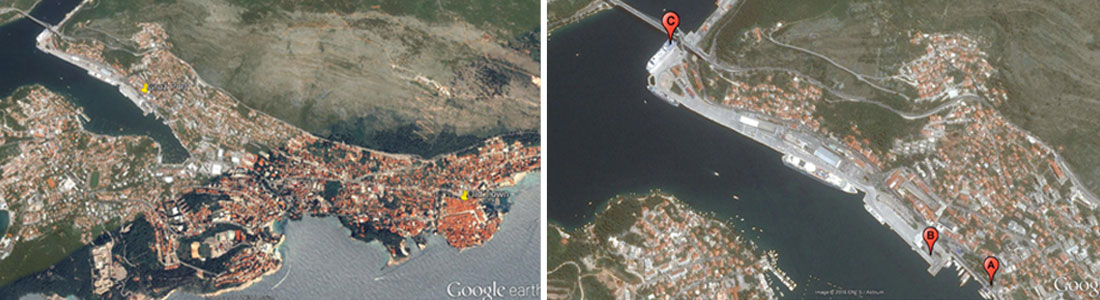 På det første kort herunder er der 2 gule mærker. Den første er Gruz havn, mens den anden er Dubrovniks gamle bydel.