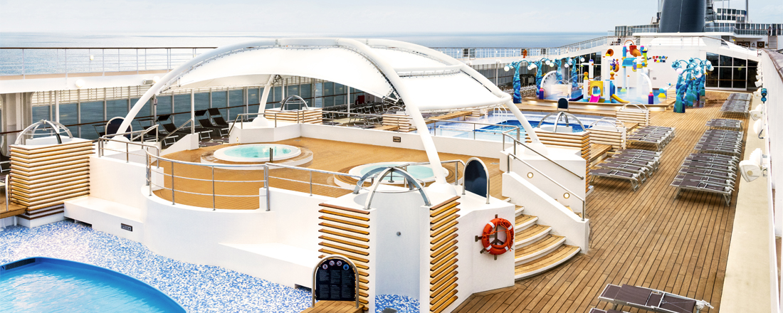 På dæk 11 finder du poolen med II Lido Bar. I bagenden ligger den store buffetrestaurant, som også er inklusive i rejsens pris. Forrest på dæk 11 finder du spa-området og baby- og miniclub. På dæk 13 findes soldækket.