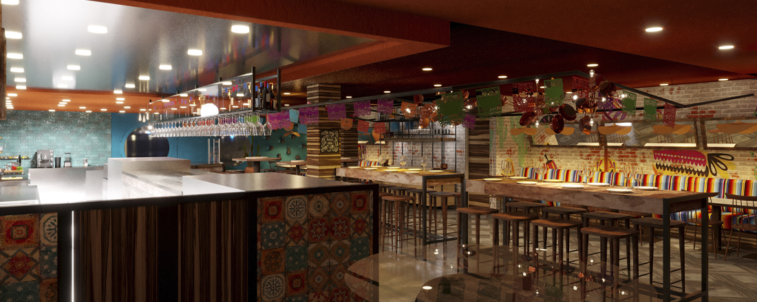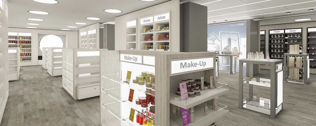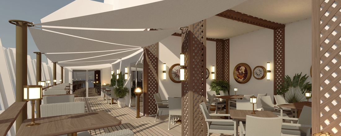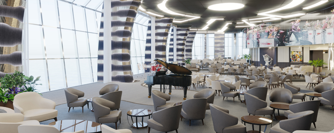 På dæk 5 finder du receptionen, teateret og enkelte kahytter, På dæk 6 og 7 finder du den imponerende indendørspromenade med LED himmel som løbende skfiter motiver. Her finder du et væld af butikker, barer, restauranter og underholdning til alle aldre.