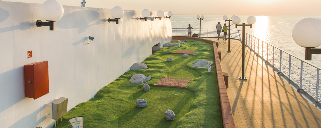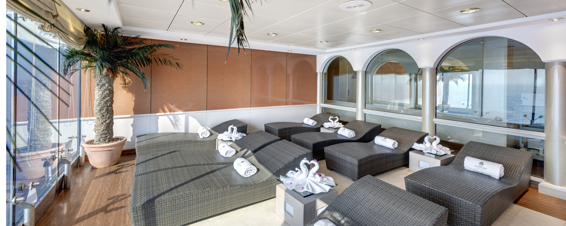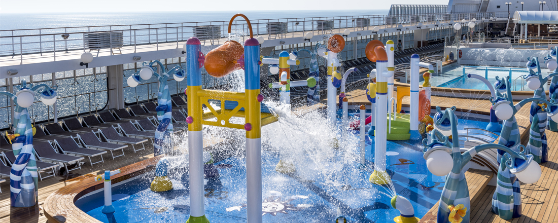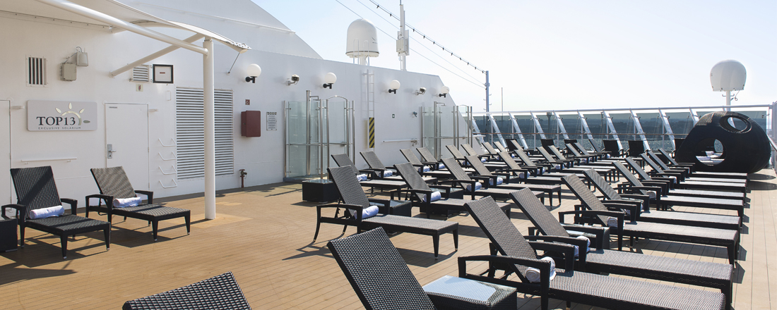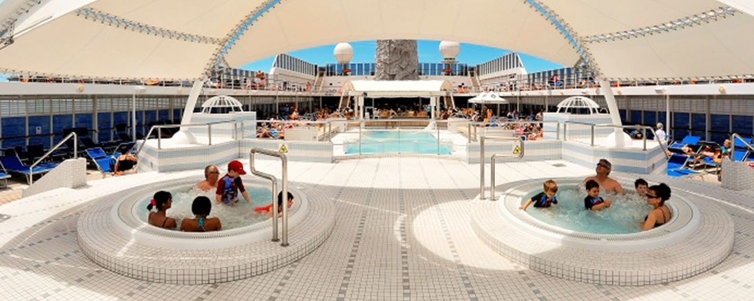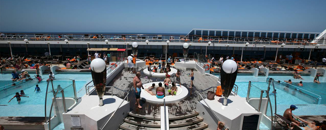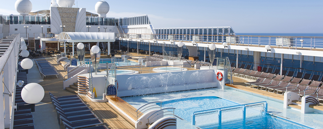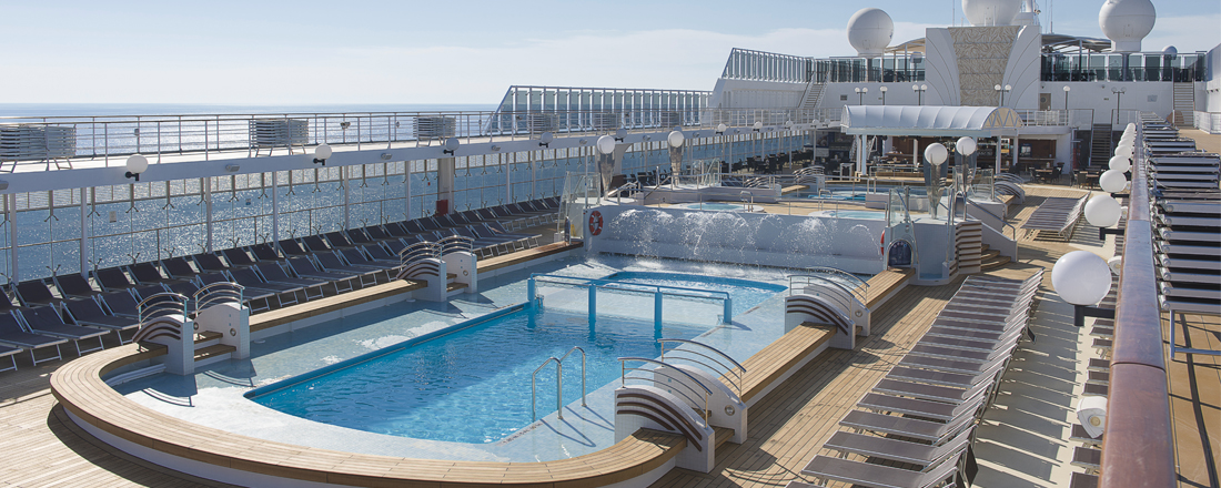 På dæk 11 finder du poolen med Lo Spinnaker Pool Bar. I bagenden er den store buffetrestaurant, som også er inklusive i rejsens pris. Forrest på dæk 11 finder du spa-området samt baby- og miniclub. På dæk 13 finder du solterrassen.