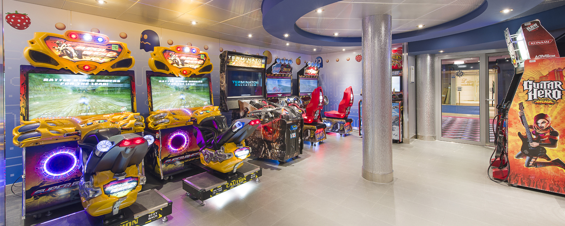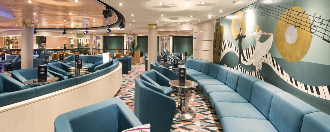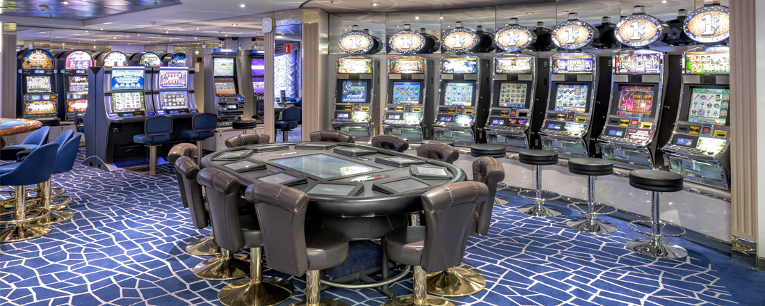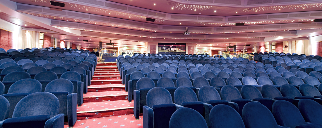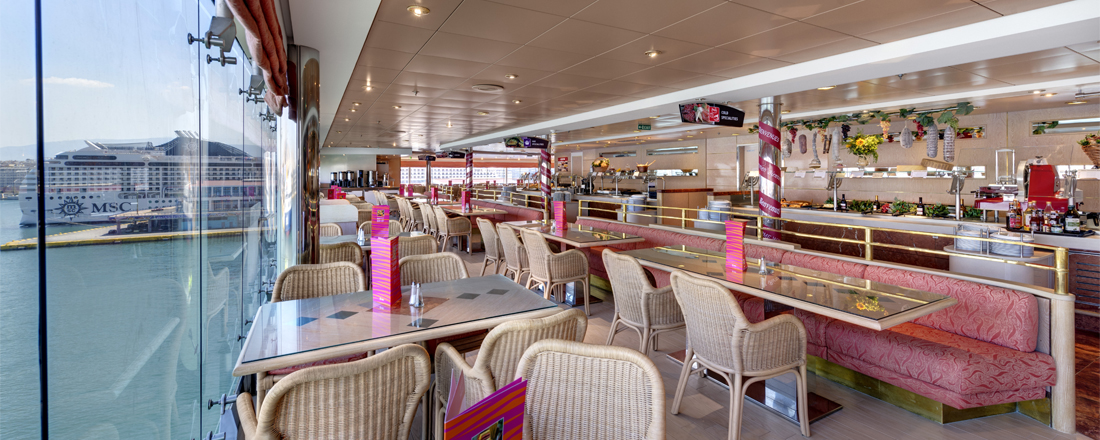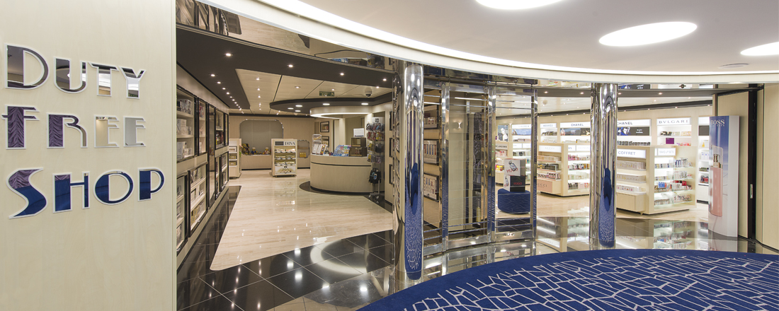 På dæk 6 finder du forskellige butikker med salg af accessories og souvenirs samt Med Pearl Casino. På dæk 5 og 6 finder du i forenden den store teatersal med musik og shows.