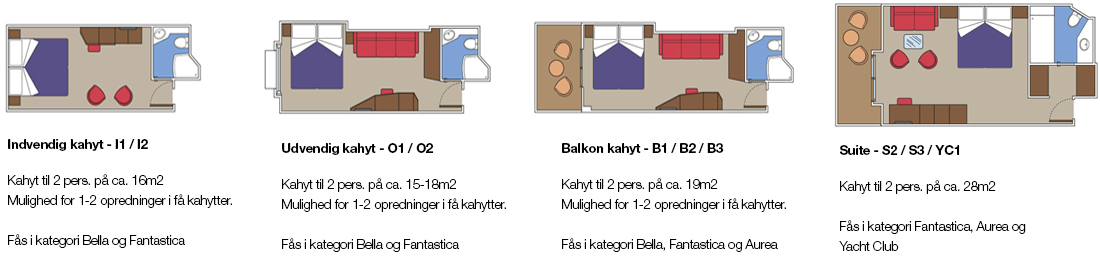 Det er muligt at købe familiekahytter, som oftest består af 2 kahytter ved siden af hinanden med forbindelsesdør imellem. Disse er dyrere end opredninger men også et godt alternativ, hvis man gerne vil have lidt ekstra plads. Derudover findes en håndfuld specialkahytter, som hører til i den dyrere ende. Disse er for gæster som gerne vil forkæle sig selv og vælger Aurea Suiter. Bemærk at når man bor i Aurea Suiter medfølger visse ekstra fordele ombord på skibet - herunder adgang til særligt eksklusive områder.