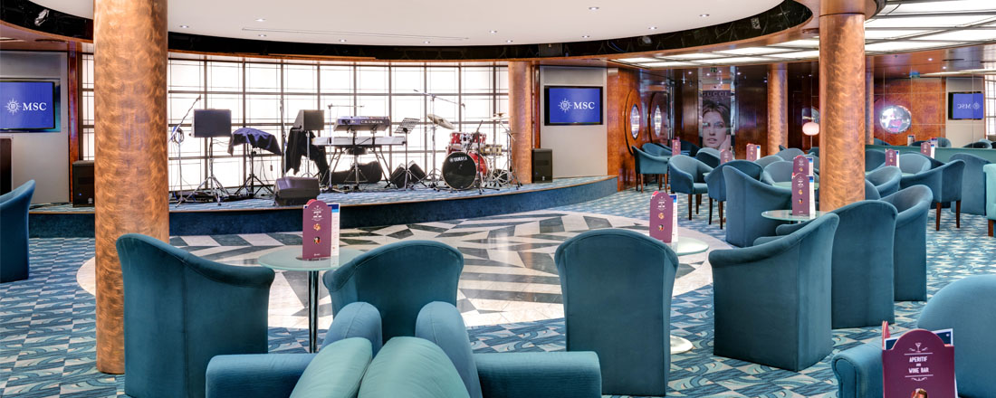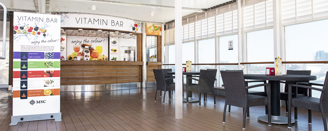 Skibet har 13 dæk, hvoraf dæk 5 til 13 er for passagerer. I forenden, midten og bagenden ligger skibets elevatorer. Dæk 5 er indgangsdæk med reception og MSC udflugtssalg. På dæk 5 og 6 findes skibets hovedrestauranter med a-la-carte servering. Disse er inkluderet i dit krydstogt. Der findes en specialrestaurant, La Terraza, som er en udendørs restaurant. På denne restaurant opkræves en merpris.