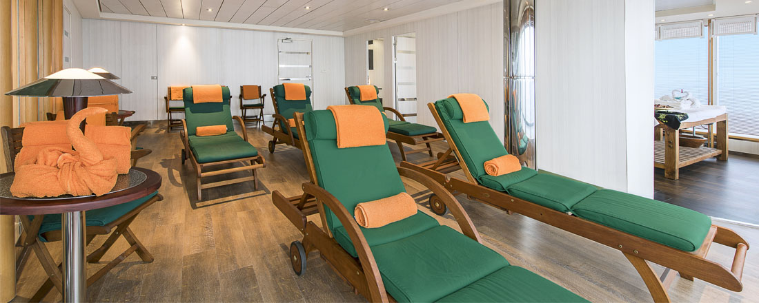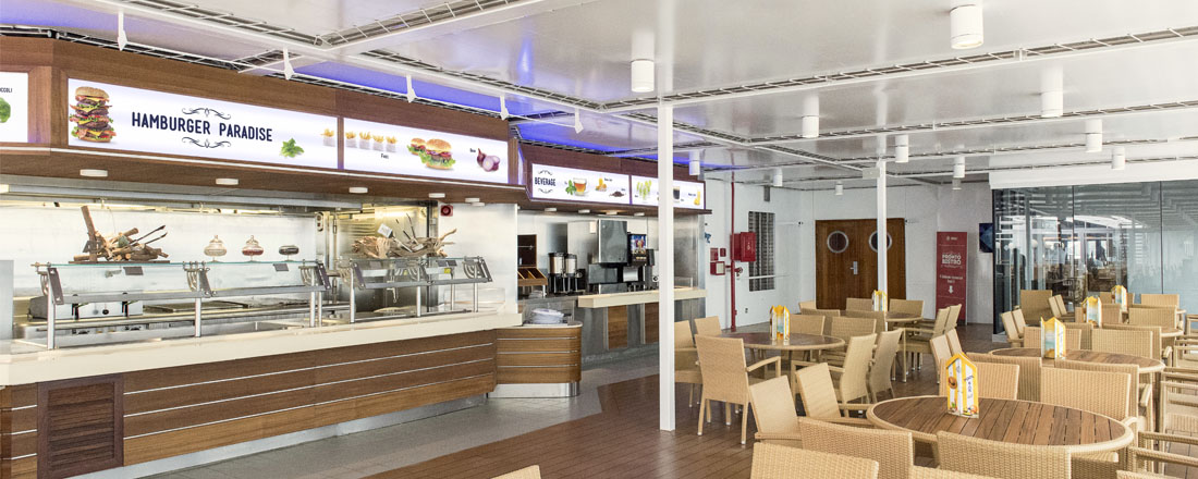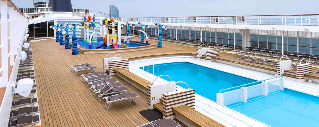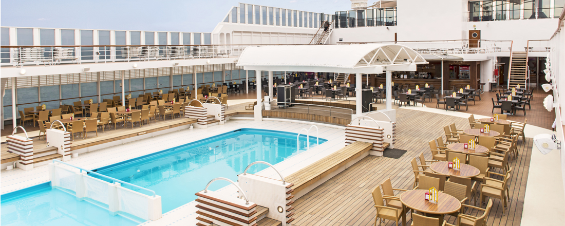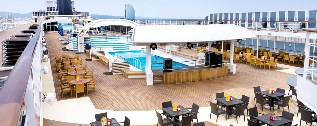 På dæk 11 finder du poolen med Capri Bar. I bagenden er den store buffetrestaurant, som også er inklusive i rejsens pris. Forrest på dæk 11 finder du spa-området og baby- og miniclub. På dæk 13 finder du soldækket.