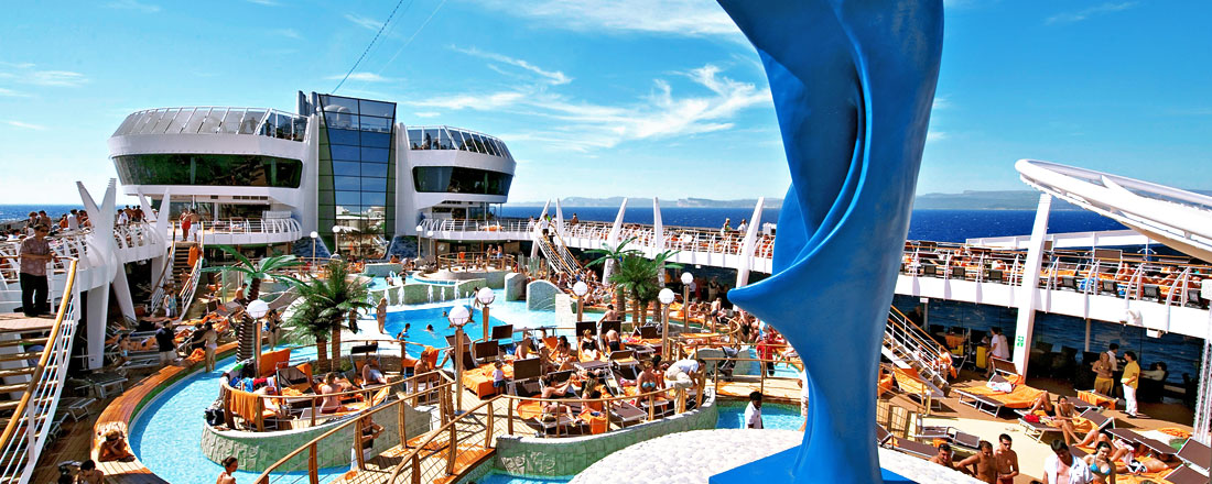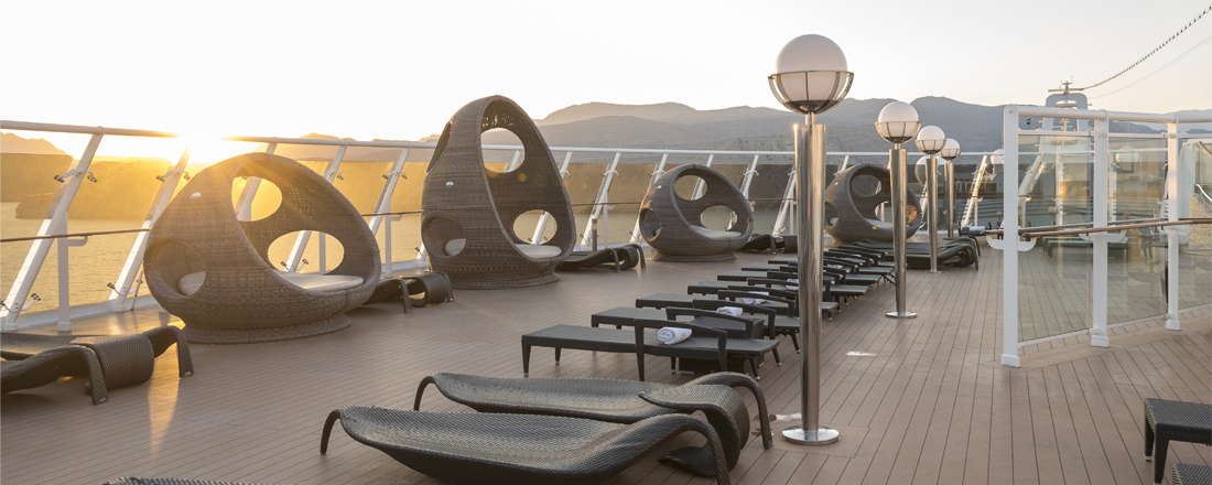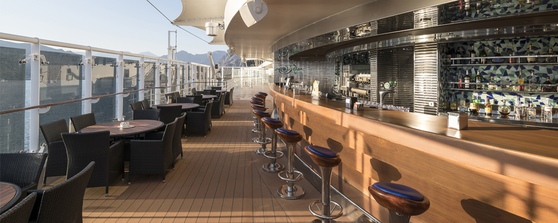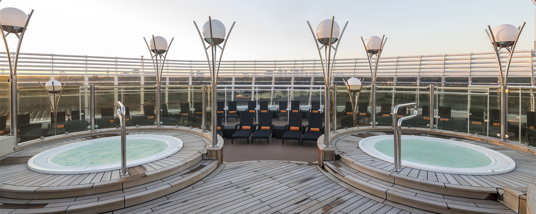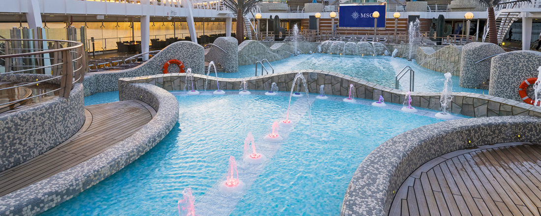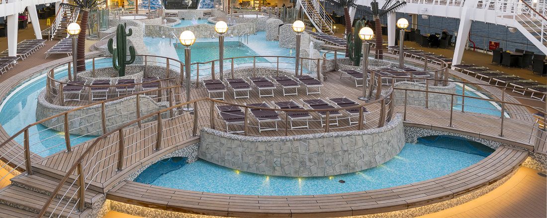 På dæk 14 ligger det indbydende soldæk med poolområde med pool, aqua park og liggestole samt Bar del Riccio og Tataruga Bar. I bagenden er den store buffetrestaurant, som også er inklusive i rejsens pris. I fronten ligger Spa-området. På dæk 15 er der i bagenden et hyggeligt udendørs barområde med en ekstra pool. Det er også her, børneklub og teen club med aktiviteter ligger. På dæk 16 finder du forskellige aktiviteter som F1-simulator, 4D-biograf samt shuffleboard.