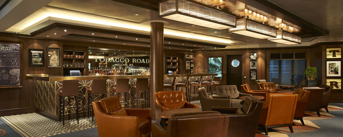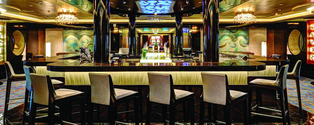 Mixx Bar og Prime Meridian er beliggende mellem flere af restauranterne og er derfor det perfekte sted for en before dinner drink. Vinelskere kan slå sig ned på The Cellars og nyde et glas merlot eller blive klogere på vin ved det særlige Tasting Table. Foretrækker du øl, så fortvivl ikke, men besøg The District Brew House, der har mere end 50 forskellige flaskeøl på køl og 24 fadøl i hanerne. Her serveres også særlige cocktails, og du kan synge med på livemusikken eller lave sjove ansigter i fotoboksen. Du kan også kombinere din drink med et godt grin på Headliner's Comedy Club, hvor komikere underholder med liveshows. Sugarcane Mojito Bar frister med lækre mojitos i utallige eksotiske varianter, mens Tobacco Road er Miamis ældste og mest legendariske bar genskabt til søs. Atrium Bar er beliggende i skibets centrum, hvor der altid er mennesker at kigge på og en god stemning. I Skyline Bar kan du i stedet se på de skiftende digitale landskaber, der oplyser væggene, og få jackpot ved bardisken, når du bestiller din cocktail. Ude på dækket finder du Spice H20, der er inspireret af beach parties på Ibiza og kun er for voksne - et afslapningsparadis om dagen og et festligt dansegulv om aftenen.