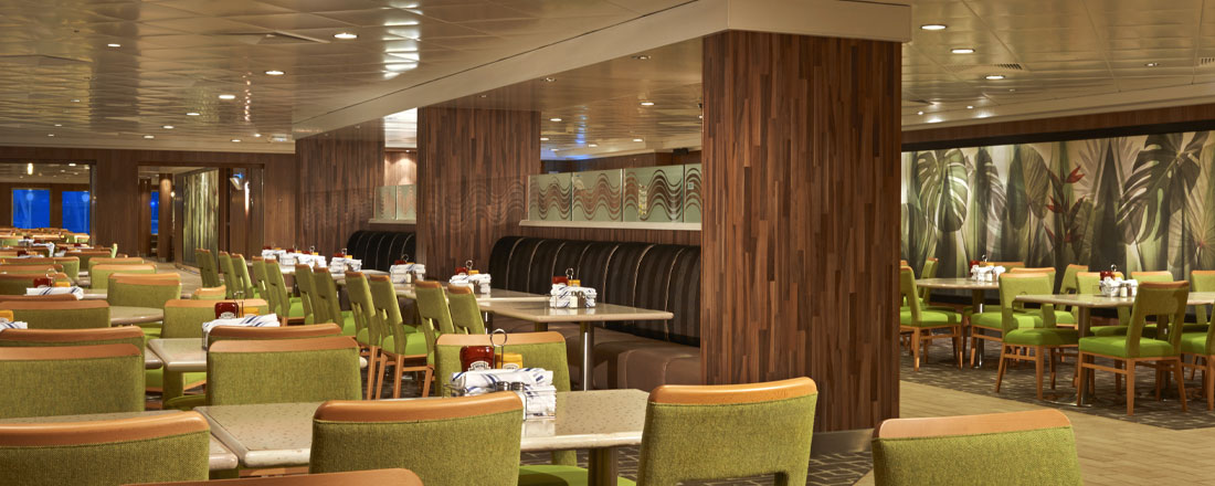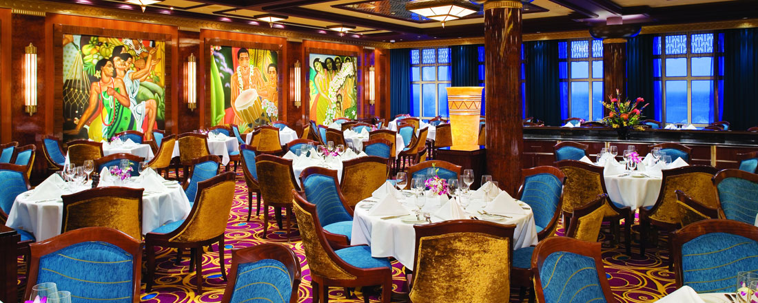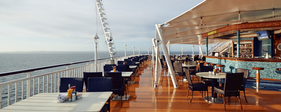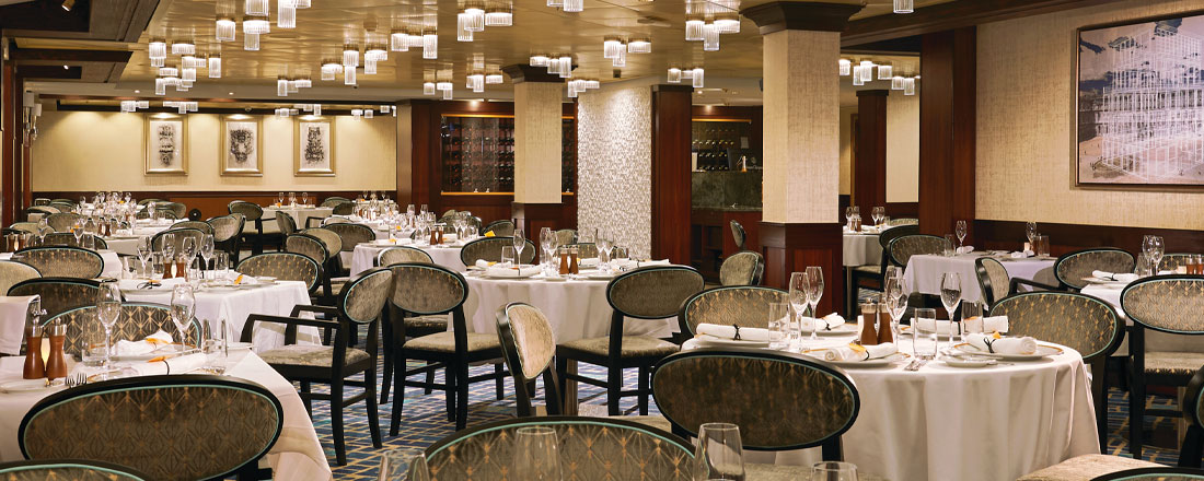 Hver aften kan du frit vælge at spise i én af de to hovedrestauranter, Alizar og Grand Pacific. De har begge en stilfuld indretning, der er både moderne og klassisk, mens atmosfæren er afslappet, og a la carte-kortet skifter dagligt, så du får forskellige kulinariske oplevelser, selvom du spiser det samme sted mere end én gang. Garden Cafe er skibets buffetrestaurant, hvortil du også har adgang. Her serveres store, inspirerende buffetter morgen, middag og aften, så uanset hvad du har lyst til, er det næsten garanteret, at du kan finde det her. Frisklavede nudler, lækre wokretter og autentiske supper serveres på den asiatiske restaurant Jasmine Garden. Endelig har du også muligheden for et mere casualt aftenmåltid på O'Sheehans Bar & Grill, hvor du kan få ægte comfort food som fish 'n' chips og shepherd's pie og skylle det ned med en kold fadøl, mens du følger en fodboldkamp på tv eller tager et spil dart. I løbet af dagen kan du også gå på Topsiders Bar & Grill eller The Great Outdoors, hvor du kan nyde havudsigten sammen med burgere og hot dogs - enten a la carte eller i form af en grillbuffet.