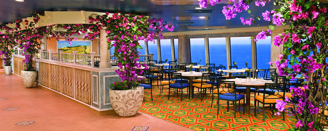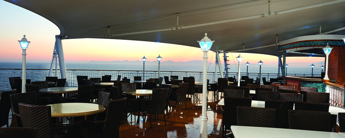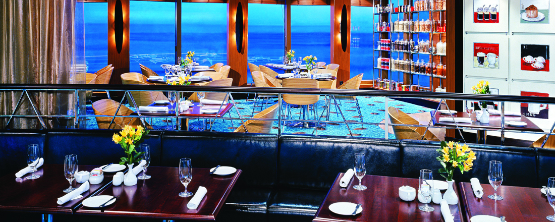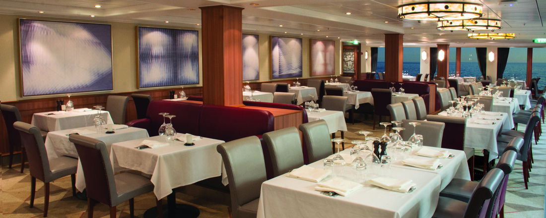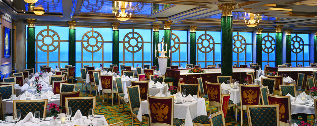 Hver aften kan du frit vælge at spise i én af de to hovedrestauranter, Alizar og Tsar's Palace. De har begge en stilfuld indretning, der er både moderne og klassisk, mens atmosfæren er afslappet, og a la carte-kortet skifter dagligt, så du får forskellige kulinariske oplevelser, selvom du spiser det samme sted mere end én gang. Garden Cafe er skibets buffetrestaurant, hvortil du også har adgang. Her serveres store, inspirerende buffetter morgen, middag og aften, så uanset hvad du har lyst til, er det næsten garanteret, at du kan finde det her. Frisklavede nudler, lækre wokretter og autentiske supper serveres på den asiatiske restaurant Chin Chin. Endelig har du også muligheden for et mere casualt aftenmåltid på O'Sheehans Bar & Grill, hvor du kan få ægte comfort food som fish 'n' chips og shepherd's pie og skylle det ned med en kold fadøl, mens du følger en fodboldkamp på tv eller tager et spil dart. I løbet af dagen kan du også gå på Topsiders Bar & Grill eller The Great Outdoors, hvor du kan nyde havudsigten sammen med burgere og hot dogs - enten a la carte eller i form af en grillbuffet.