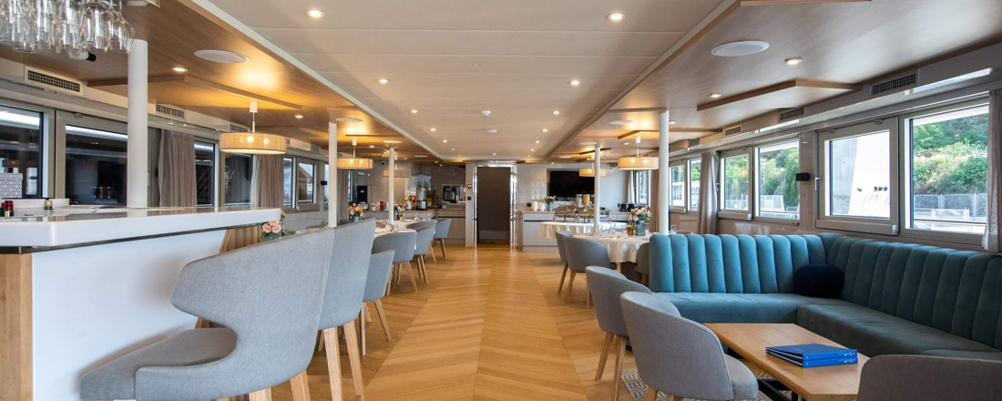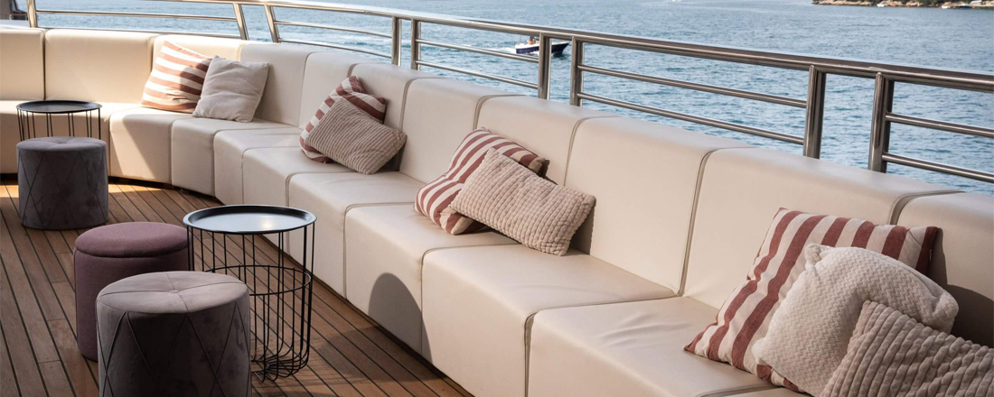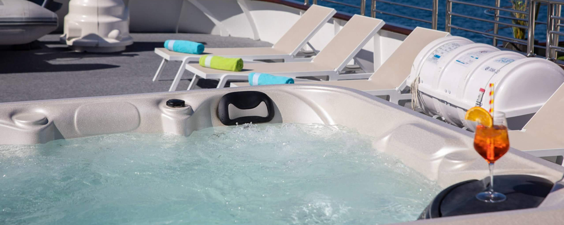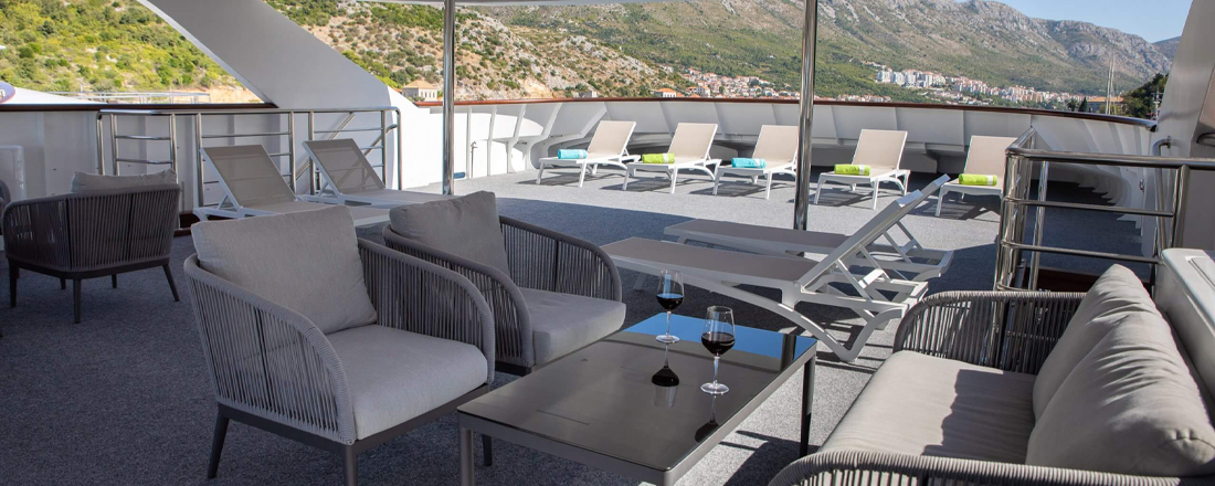 Øverst oppe ligger soldækket på 390 m2 - her fås en ægte wow oplevelse! På dækket er der en dejlig udendørs jacuzzi samt en masse liggestole. Et behageligt sted at nyde solen, mens man sejler og kan mærke en let brise. Soldækket har endvidere et antal parasoller. På det øvre dæk ligger skibets airconditionerede salon-restaurant med store panoramavinduer. Her finder man også baren og loungeområde med LCD TV samt buffetområde. Lige ved siden af ligger en overdækket terrasse med en vidunderlig udsigt. Her kan pressenningvægge sættes på og tages af afhængig af vejret. Terrassen er indrettet med liggestole, stole og borde. I tilfælde af meget vind kan området dækkes til. Når der bliver tid til en dukkert, er skibet bagpå udstyret med en lille svømmeplatform med 2 stiger, udendørs bruser og toiletter. Der kan lejes strandhåndklæder ombord.