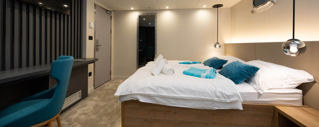 De rummelige kahytter variere i størrelse fra 13-18m2. De er alle indrettet med en dobbeltseng (200x160 cm) eller 2 enkeltsenge (200x90 cm) . På hoveddækket findes de 11 ud af 29 kahytter. De er alle med vinduer og nogle af kahytterne er også med en ekstra seng. De sidste kahytter findes på standartdækket hvor der er 2 koøjer på værelserne. Her er nogle af kahytterne også med ekstra seng. Alle kahytter har endvidere eget badeværelse med bruser og hårtørrer. På forespørgsel kan enkelte af kahytterne tage 3 personer. Der er desuden aircondition, sat TV, 220 volt, radio samt fri wi-fi ombord.