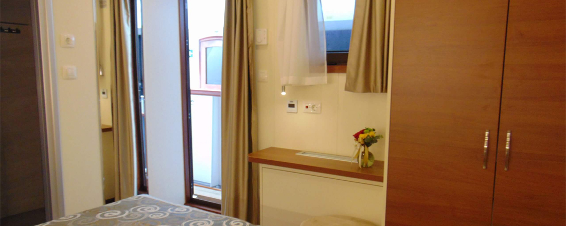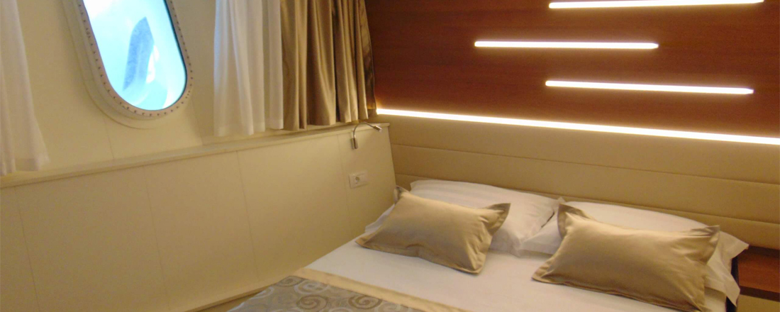 På nederste dæk er der 8 kahytter. De er indrettet med enten en dobbeltseng (200x160 cm) eller 2 enkeltsenge (200x90 cm) samt 2 stk koøjer. Dog findes der én kahyt her som er med en ekstra seng. På hoveddækket er der 9 kahytter. De er ligeledes indrettet med en dobbeltseng (200x160 cm) eller 2 enkeltsenge (200x90 cm) samt et større vindue og et koøje i badeværelset. Også her findes én kahyt med en ekstra seng. Kahytterne svinger i størrelse fra 11-13m2. Alle kahytter har endvidere eget badeværelse med bruser og hårtørrer. Der er desuden aircondition, sat TV, 220 volt, samt fri wi-fi ombord.