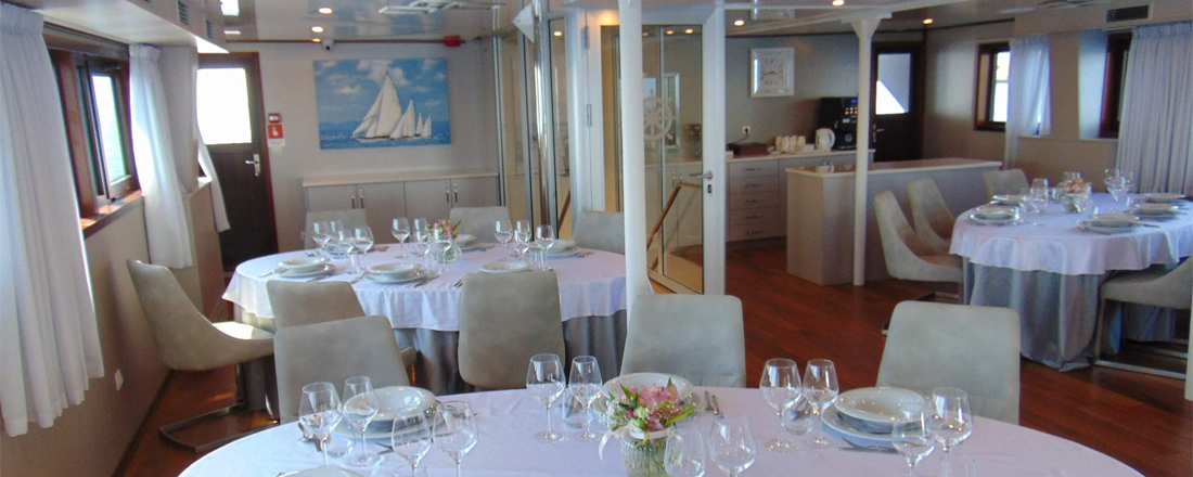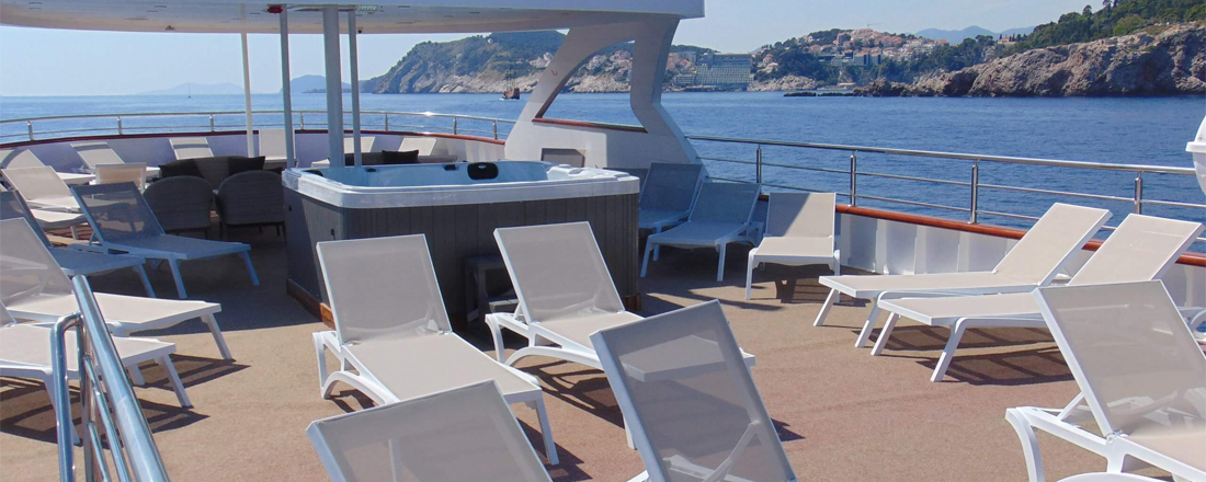 Øverst oppe ligger soldækket - her er der en dejlig udendørs jacuzzi samt en masse liggestole. Et behageligt sted at nyde solen, mens man sejler gennem det fortryllende landskab. En del af soldækket er overdækket, så der også er mulighed for skygge. På det øvre dæk ligger skibets airconditionerede salon-restaurant med store panoramavinduer. Her finder man også baren og loungeområdet med LCD storskærm samt buffetområde. Lige ved siden af ligger en overdækket terrasse med en vidunderlig udsigt. Terrassen er indrettet med liggestole, stole og borde. I tilfælde af meget vind kan området dækkes til. Når der bliver tid til en dukkert, er skibet bagpå udstyret med en lille svømmeplatform med 2 stiger, udendørs bruser og toiletter. Der kan lejes strandhåndklæder ombord.