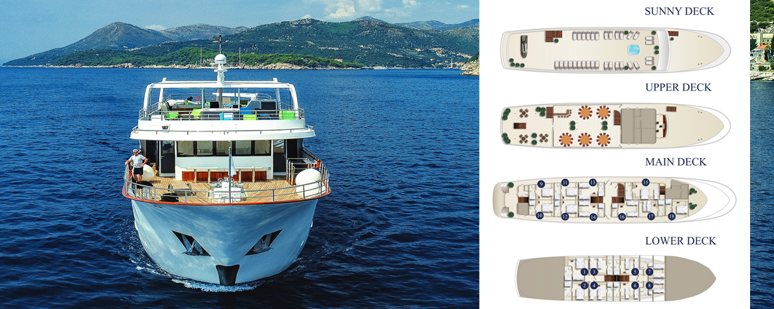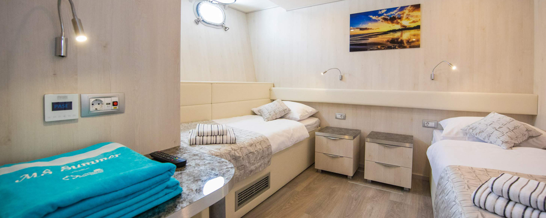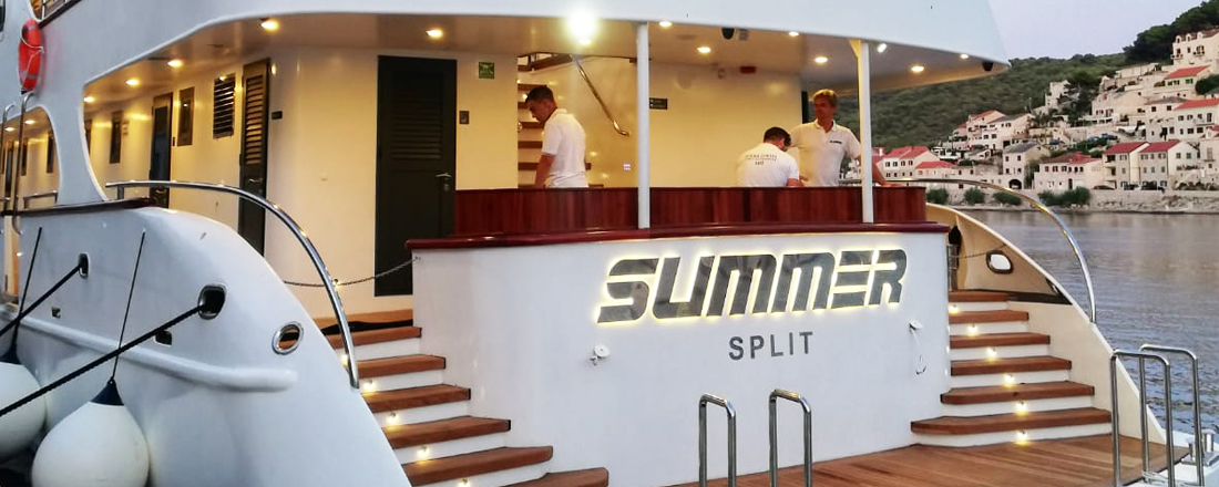 Yacht crusing langs den charmerende kroatiske kyst er mere populært end nogensinde. Livet ombord er fyldt med overraskelser, og hver dag oplever du mindst ét nyt og spændende område - ofte flere. Besætningen forkæler dig, mens du roligt sejler fra den ene stemningfulde og hyggelige middelalderby til den næste. Undervejs er der rig mulighed for en skøn dukkert i Adriaterhavets krystalklare vand. Havets beroligende vuggen og bølgernes lette skvulp er både søvndyssende og afslappende. Hvad mere kan man drømme om? M/S Summer er som et flydende luksushotel bygget i henhold til de nyeste EU standarder. Et moderne skib med al den nyeste teknologi. Der er plads til 38 passagerer, hvilket skaber en god og intim afmosfære. På få dage har man styr på hvilke gæster, man klikker med. Der er 4 passagerdæk på skibet, hvor de 2 nederste er med kahytter, og de 2 øverste er velindrettede fællesområder.