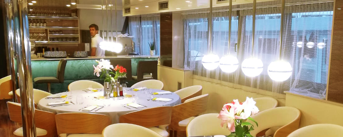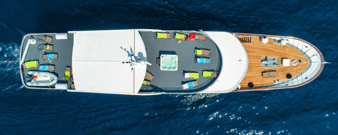Øverst oppe ligger soldækket på 340 m2 - her fås en ægte wow oplevelse! På dækket er der en dejlig udendørs jacuzzi samt en masse liggestole. Et behageligt sted at nyde solen, mens man sejler og kan mærke en let brise. En del af soldækket er overdækket, så der også er mulighed for skygge. På det øvre dæk ligger skibets airconditionerede salon-restaurant med store panoramavinduer. Her finder man også baren og loungeområdet med LCD storskærm samt buffetområde. Lige ved siden af ligger en overdækket terrasse med en vidunderlig udsigt. Terrassen er indrettet med liggestole, stole og borde. I tilfælde af meget vind kan området dækkes til. Når der bliver tid til en dukkert, er skibet bagpå udstyret med en lille svømmeplatform med 2 stiger, udendørs bruser og toiletter. Der kan lejes strandhåndklæder ombord.