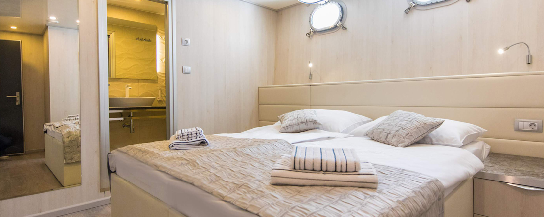 På nederste dæk er der 8 kahytter på 14-16 m2. De er indrettet med enten en dobbeltseng (200x160 cm) eller 2 enkeltsenge (200x90 cm) samt 2 stk koøjer. På hoveddækket er der 9 kahytter på 13-15 m2. De er ligeledes indrettet med en dobbeltseng (200x160 cm) eller 2 enkeltsenge (200x90 cm) samt et større vindue og et koøje i badeværelset. Alle kahytter har endvidere eget badeværelse med bruser og hårtørrer. Der er desuden aircondition, sat TV, 220 volt, samt fri wi-fi ombord.