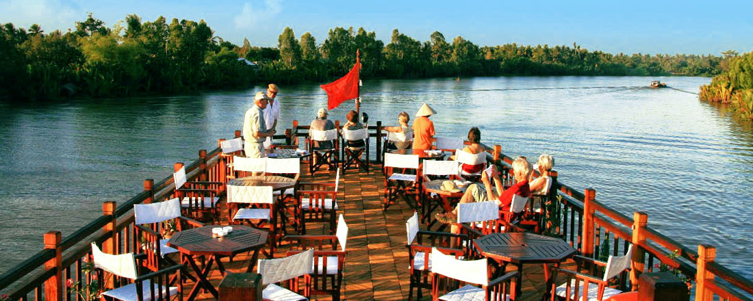 Vi skifter scene og kommer til Vietnams flodrige Mekongdelta. Ombord på den hyggelige cruisebåd opleves det på tæt hold. Vi drager på cykeltur udi landlige egne og små landsbyer, vi har flere sejlture på mindre floder og ind i små kanaler for at komme tæt på landsbylivet og et stort flydende marked. Vi nyder aftener og middage ombord mens verdens største spisekammer langsom passerer forbi os. Rejsen slutter i storbyen Saigon alias Ho Chi Minh City. Der er tid til den sidste shopping eller måske en afsluttende historisk udflugt til de underjordiske tunnelsystemer fra Vietnam krigen, inden vi mætte af oplevelser sætter kursen mod Danmark.