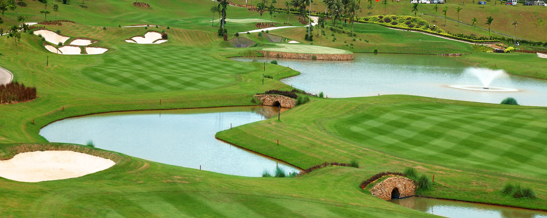 En par-72 bane i parklignende omgivelser. Ved første øjekast ser banen ikke svær ud - tværtimod. Vi kan godt afsløre at kun de færreste kommer ind i deres handicap. Man bliver udfordret! Et par af banens unikke kendetegn er de meget lodrette kanter på flere af deres forholdsvis dybe bunkers kombineret med de hurtige greens, som straffer hårdt hvis aflæsningen ikke er gjordt ordentlig. Almindelige fairway bunkers er elegante og mange har form som en lotusblomst. Midt på front-ni og back-ni ligger der en charme-hytte hvor der kan holdes pause. Disse er placeret lidt i højderne så udsigten over banen kan nydes, mens man får lidt tiltrængt væske indenbords. Alle greens er tæppebelagt af den populære græstype Bermuda Tifdwarf, mens Hybrid Zoysia bruges på tee bokse og fairways. Greenspeed ligger generelt på 10.5.
