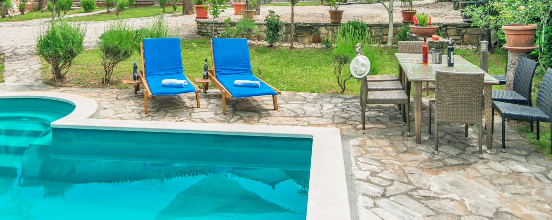 Hele den store grund oser af hygge og afslapning. Gårdhaven og terrassen er omkrandset af lavendelplanter, laurbær, rosmarin, lime, valnød og egetræer. En liflig duft spreder sig afhængig af årstiden. Dele af terrassen er overdækket med mulighed for at gøre brug af en udendørs pejs/grill og spise udendørs i skyggen. Bagest i haven er et lækkert og indbydende poolområde. Hele området er udstyret med havemøbler, solsenge, parasol, der naturligt giver små oaser omkring pool og terrasser. Villaen har gratis parkering ved huset. Huset er udstyret med aircondition og centralvarme. Ring og hør om ledige datoer.
