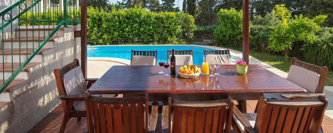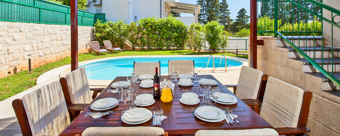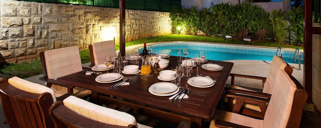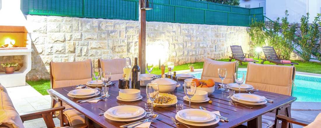 Med så vidunderlig en beliggenhed tæt på strand og vand vil en stor del af livet foregå udendørs. Her ligger en dejlig have med en overdækket terrasse mod syd. Herunder står et spisebord til 8 personer så man kan nyde måltiderne ude. Til den ene side er der en ægte kroatisk grill som er til fri afbenyttelse. Foran terrassen ligger ved hver villa en dejlig pool på 24m2 og som er ca. 1,40 m dyb. Rundt om poolen er der et liggestole. Der er badehåndklæder inkl. - disse skiftes 1 gang ugentlig. Villaen har en parkering tæt ved huset. Der er mulighed for at medbringe en hund ved forudforespørgsel (max 2 kg). Hele huset har aircondition, centralvarmesystem, samt wifi. Check in foregår på nærliggende Aparthotel Pharia.
