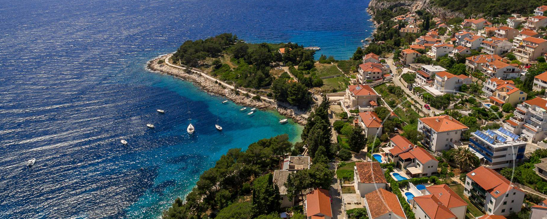Husene ligger på en 500m2 villagrund med fliser rundt om poolen. Lige ud for bugten hvor i bor ligger Pakleni Islands som absolut er værd at besøge. I øgruppen findes fine strande og dejlige små beachrestauranter som er et besøg værd. Der går taxibåde dertil. Et alternativ kunne være at leje en båd. Lige nede ved strandpromenaden kan der lejes små og større både (de mindste er også til folk uden sejlererfaring og koster 8-1000 kr for en hel dag inkl. benzin).