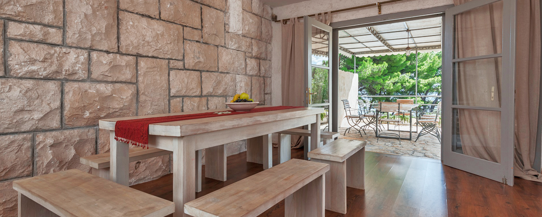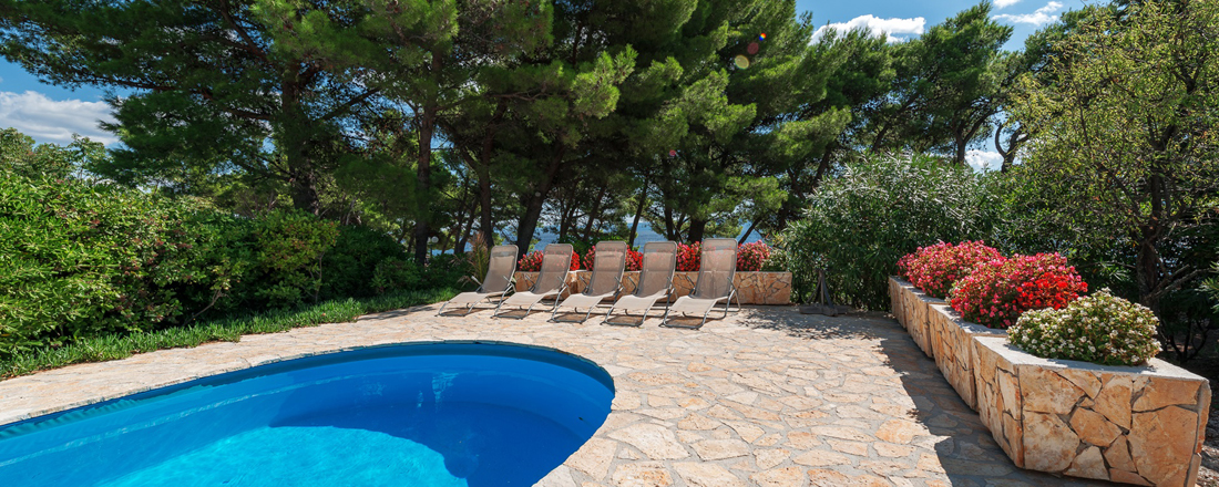 Få villaer kan brøste sig af en så fantastisk beliggenhed - direkte ud til strandpromenaden og havet. Samtidg tager det et minut at gå til byen og max 10-12 minutter at gå til eventyrstranden Zlatny Rat. Huset ligger på en 600m2 stor grund som er anlagt i 2 etager. Øverst ligger en overdækket terrasse med adgang til stueetagen. 10-12 trin nede ligger den store terrasse med poolområdet, liggestole og hyggekrog. Haven er hyggelig omkrandset af træer og buske og der går en lille sti ned til vandet. Der er sengelinned og håndklæder inkl. - disse skiftes 1 gang ugentlig. Villaen har en parkeringsplads. Der er mulighed for at medbringe en hund ved forudforespørgsel. Hele huset har aircondition, centralvarmesystem, samt wifi.