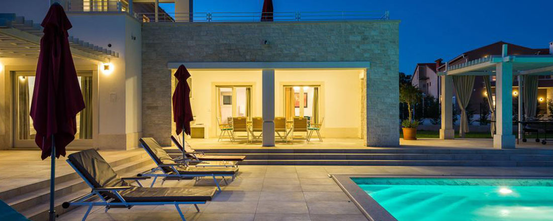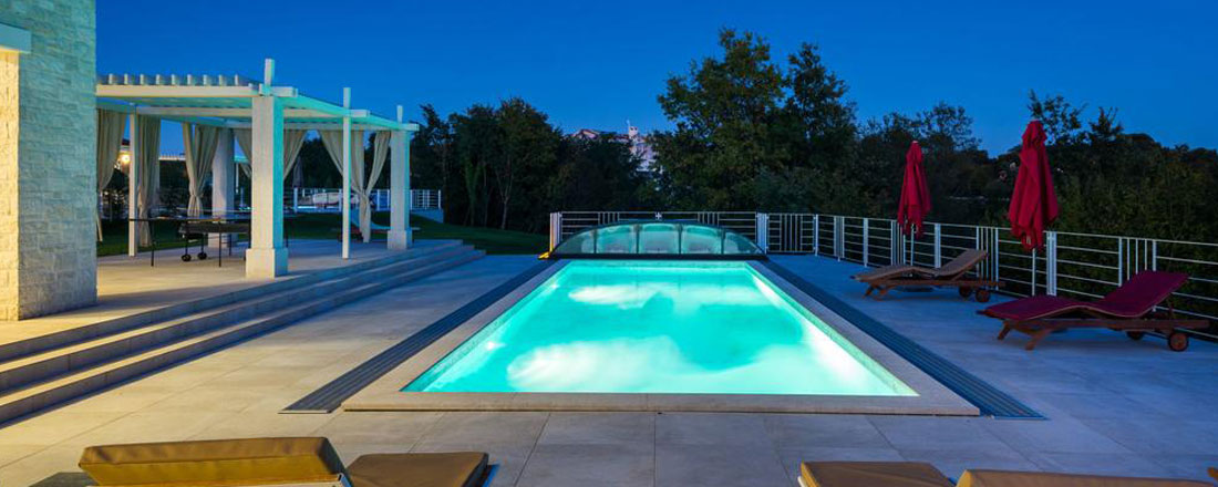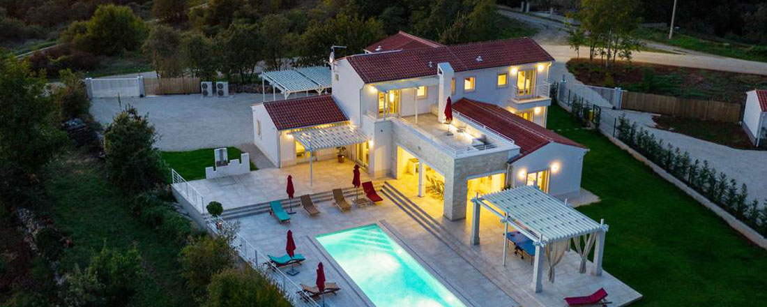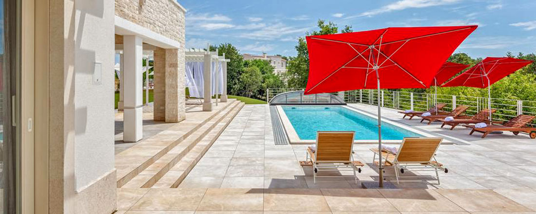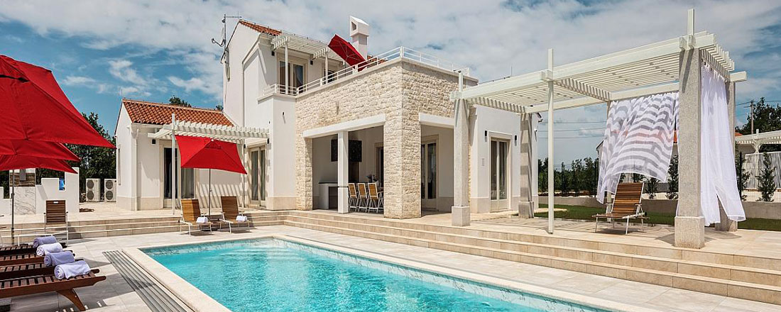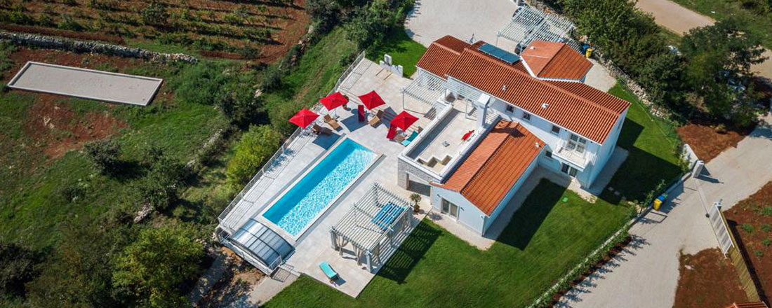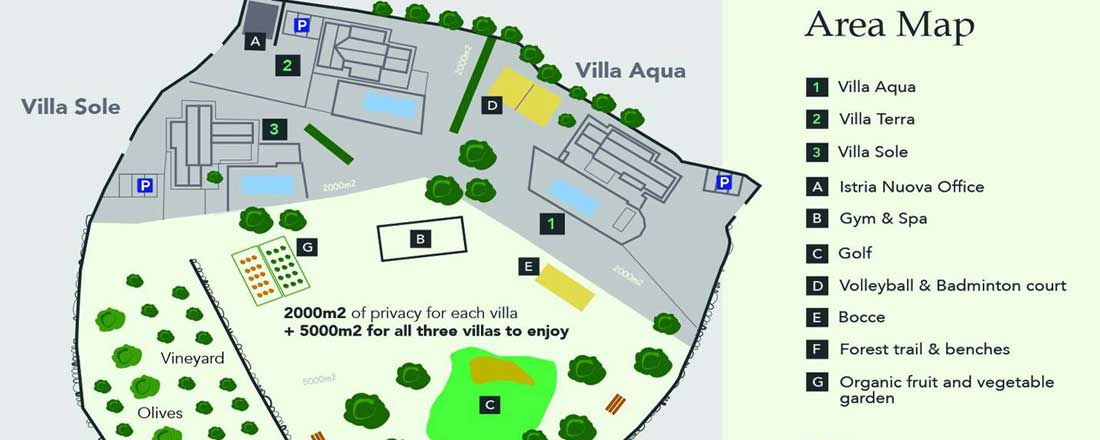 Istria Nuova’s Villa’s består af 3 separate luksus villaer fordelt på 11.000m2 i den lille Istrianske landsby Reanci. Villaerne ligger i udkanten af Rezanci i et skovområde med skøn natur. Hver villa har sin egen grund på 2000m2 med poolområde og egen have med Middelhavsplander. Dertil kommer et fælles skov og græsareal med vandrestier og bænke på 5.000m2. Fællesområdet byder ikke kun på dejlig natur men også en perlerække af lækre aktivitetsmuligheder til aktive gæster. Disse er til rådighed for gæster i alle 3 villaer. De 3 Villaer er: Villa Aqua, Villa Terra og Villa Sole.