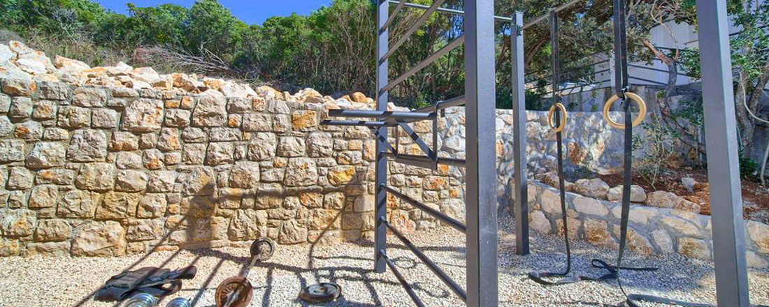 Udenfor foran opholdsstuen er der en stor solterrasse med opvarmet pool og et opholdsområde med udsigt over havet og stranden. Rundt om poolen er der solsenge og på terrassen er der en stor parasol. Spisepladsen med grill er bare perfekt til socialt samvær. Ved siden af solterrassen er der et udendørs motionscenter, hvor du kan holde dig i form og være aktiv, mens du nyder strand solnedgange. Villaen er indhegnet hele vejen rundt så det er ingen problemer med mindre børn. Designet af huset gør at der er en unik panoramaudsigt. Villaen favner fuldt ud både indendørs og udendørs livsstil og den betagende udsigt vil efterlade dig med uforglemmelige øjeblikke og evige minder.